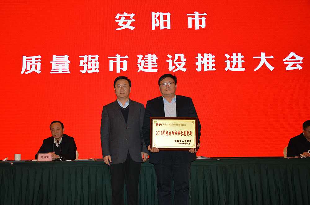 安陽全豐生物科技有限公司榮獲“安陽市市長質(zhì)量獎”榮譽稱號,董事長王志國代表安陽全豐生物科技有限公司上臺領(lǐng)獎。