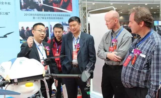 蘭玉斌教授帶著美國(guó)農(nóng)業(yè)部農(nóng)業(yè)科學(xué)研究署B(yǎng)radley K Fritz 高 級(jí)研究員和昆士蘭大學(xué)施藥與安全中心Andrew Hewitt 教授/主任 等一行學(xué)者前往安陽(yáng)全豐航空展位參觀,并向兩位外賓介紹全豐,周總為參觀學(xué)者介紹全豐油機(jī)電機(jī)。