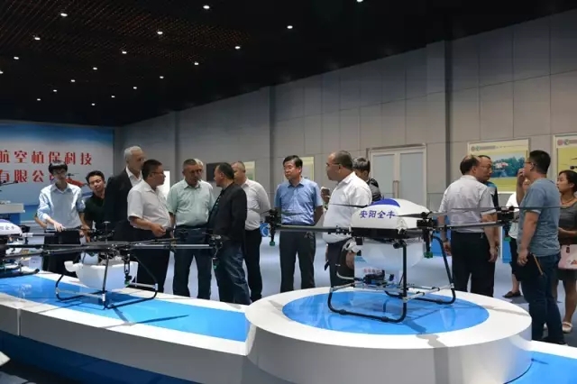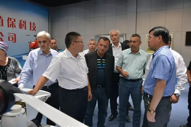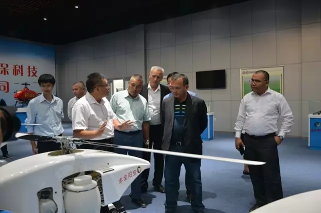 考察團一行在全豐航空董事長王志國的陪同下,首先參觀了無人機展廳。當王總介紹3WQF120-12型油動單旋翼植保無人機時,塔沙耶夫和隨行專家詳細詢問了該款機型的載重及續(xù)航能力,每天的作業(yè)量有多少,一天能夠起飛多少個架次,邊聽介紹邊讓工作人員詳細記錄下來。