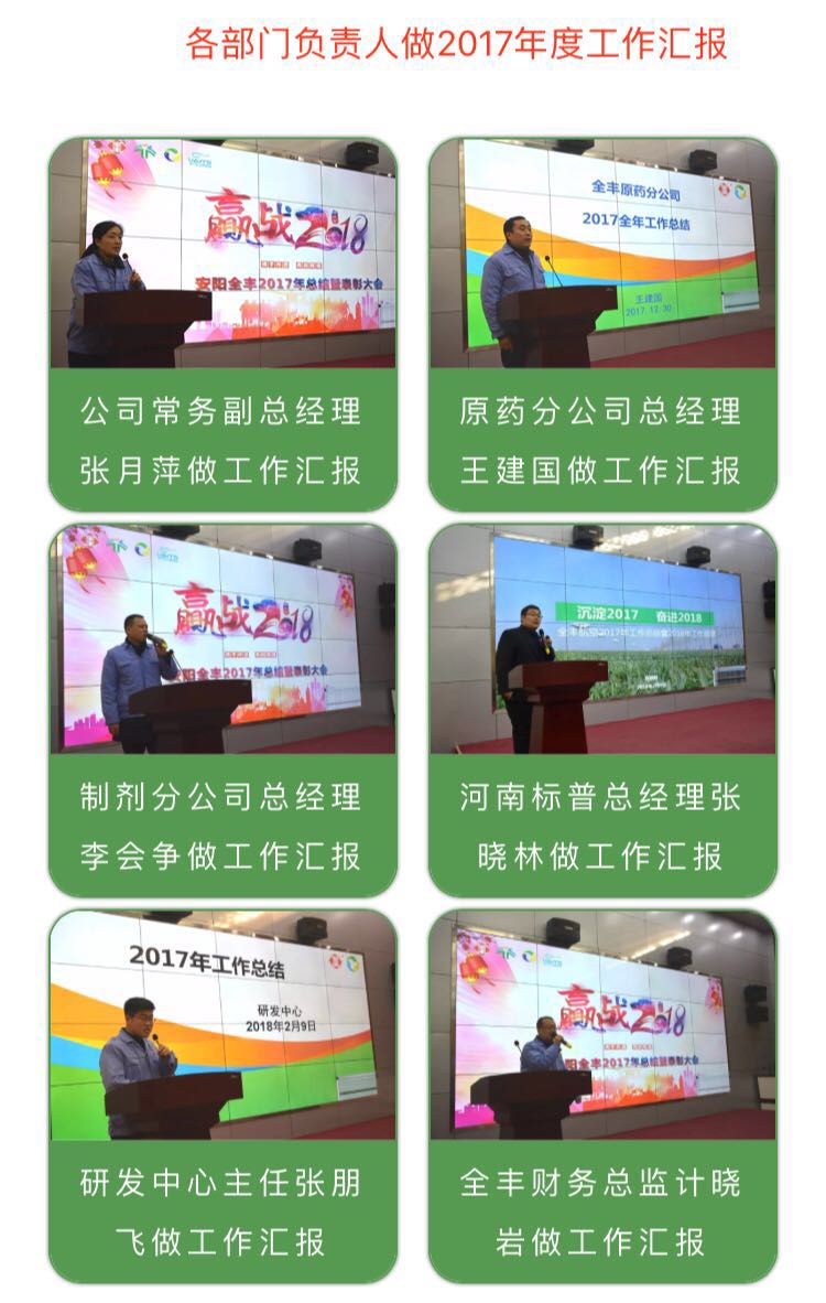 會上各部門負(fù)責(zé)人就2017年工作進行了認(rèn)真總結(jié),并提出2018年工作規(guī)劃和目標(biāo),公司董事長、總經(jīng)理王志國做了公司2017年工作報告。王總講到,過去的2017年在所有全豐人的共同努力下,公司取得了一定的工作業(yè)績,成立了院士工作站,被國家農(nóng)業(yè)部確定為國內(nèi)一家航空植保重 點實驗室,并獲得全國五一勞動獎狀。安陽全豐已初步完成農(nóng)業(yè)產(chǎn)業(yè)化布局。依托現(xiàn)有原藥和制劑業(yè)務(wù)板塊,全豐航空和標(biāo)普農(nóng)業(yè)立足智慧農(nóng)業(yè)五大模塊持續(xù)發(fā)力,力爭做國內(nèi)行業(yè)智慧農(nóng)業(yè)服務(wù)商,并談到全豐未來三至五年的發(fā)展規(guī)劃。