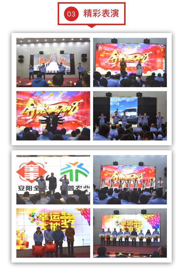隆重的總結(jié)表彰活動結(jié)束后,以“奔跑吧2018”為主題的聯(lián)歡會拉開序幕。原藥分公司的一曲《我是中國人》唱出了全豐人的豪邁,太行培訓(xùn)學(xué)校表演的舞蹈《舞動青春》和制劑分公司表演的《新春舞會》有異曲同工之妙,博得現(xiàn)場陣陣掌聲,標(biāo)普公司表演的小品《我是飛行員》把一個失戀青年加入飛防隊伍后的徹底蛻變刻畫得惟妙惟肖。飛防隊的小伙子們也帶來驚喜,太極拳表演柔中帶剛、虎虎生威,生產(chǎn)技術(shù)部的男女聲獨唱和財務(wù)部的二胡表演各具特色,活動現(xiàn)場的幸運抽獎環(huán)節(jié)更是讓現(xiàn)場歡呼聲和掌聲此起彼伏。歡笑聲中,全豐人告別了2017年,2018年我們攜手并進,再創(chuàng)輝煌!全豐人贏戰(zhàn)2018!加油干!